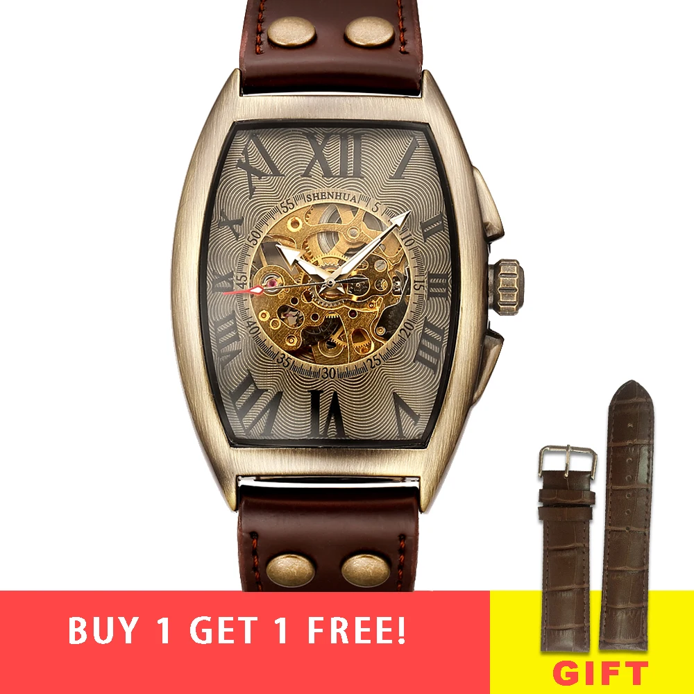 | Shenhua 2019 Vintage Automatic Watch Men Mechanical Wrist Watches Mens Fashion Skeleton Retro Bronze Watch Clock montre homme |