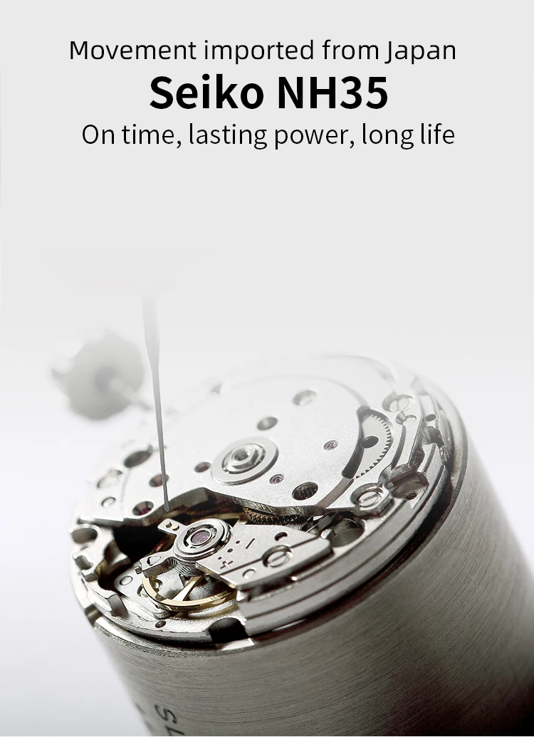 - Precise Japan Seiko NH35A Mechanical movement for accurate time keeping