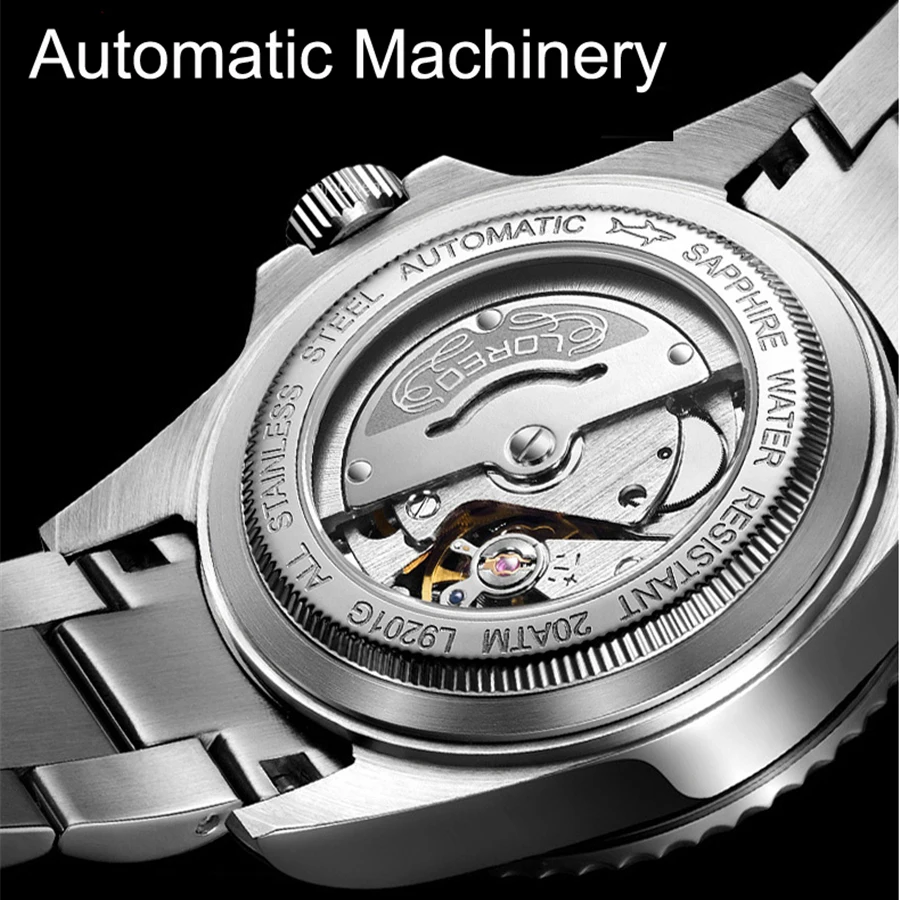 LOREO Mens Automatic Mechanical Fashion Top Brand Sports Watches 200M Diving Waterproof Stainless Steel Watch Relogio Masculino