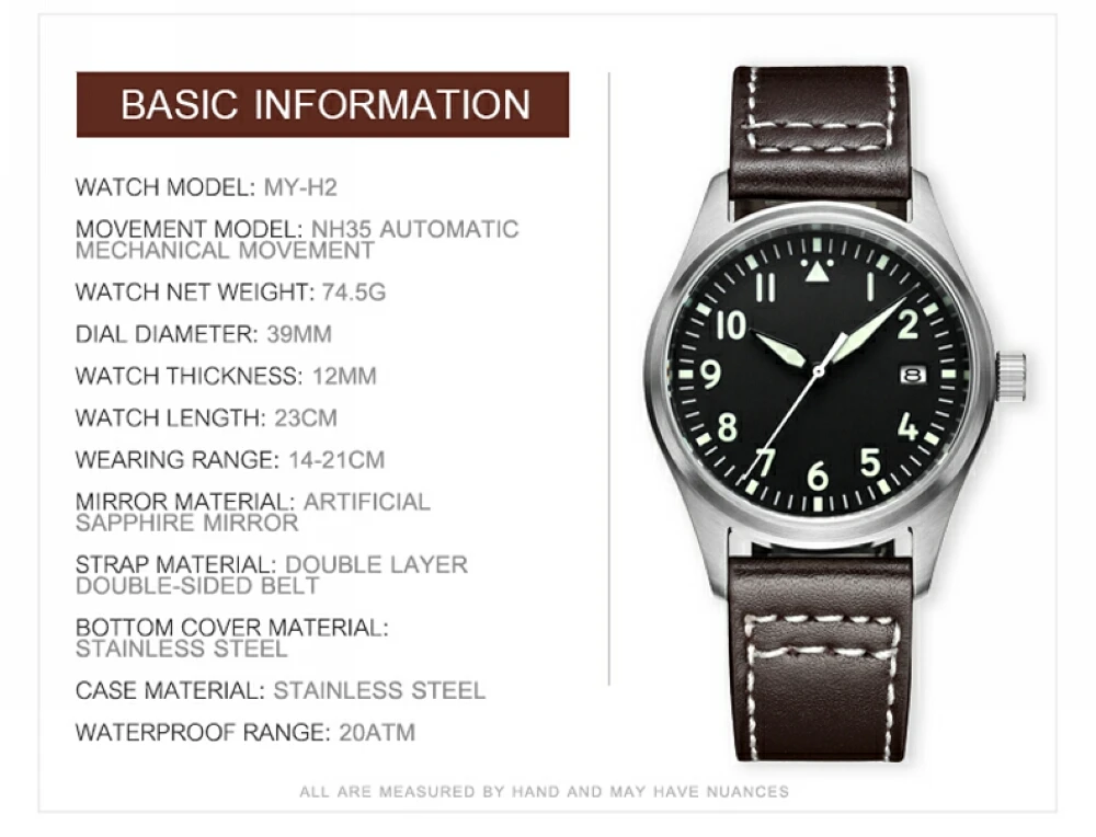 Model: MY-H2Movement: Japan NH35A automatic mechanical movementCase: Material - 316L stainless steel39mm in diameter (excluding crown)Length 49mm (including lugs)Thickness 12mm (including crystal)Ear width 20mm (with the inside of the strap)Mirror: sapphire crystal mirror, inner shadowless anti-reflective filmPanel: BlackPointer: luminous pointerLuminous: Swiss C3 super luminous (light color: green)Crown: Screw-in, size 6mmBottom cover: screw-in bottom coverStrap: imported high-grade silicone strap / leather strapWaterproof: 200 meters waterproofWarranty: Two-year warranty