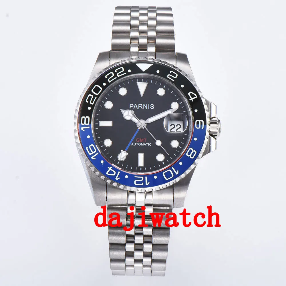 40mm PARNIS black dial luminous sapphire blue black red blue ceramic bezel GMT luxury automatic men's watch top brand mechanical