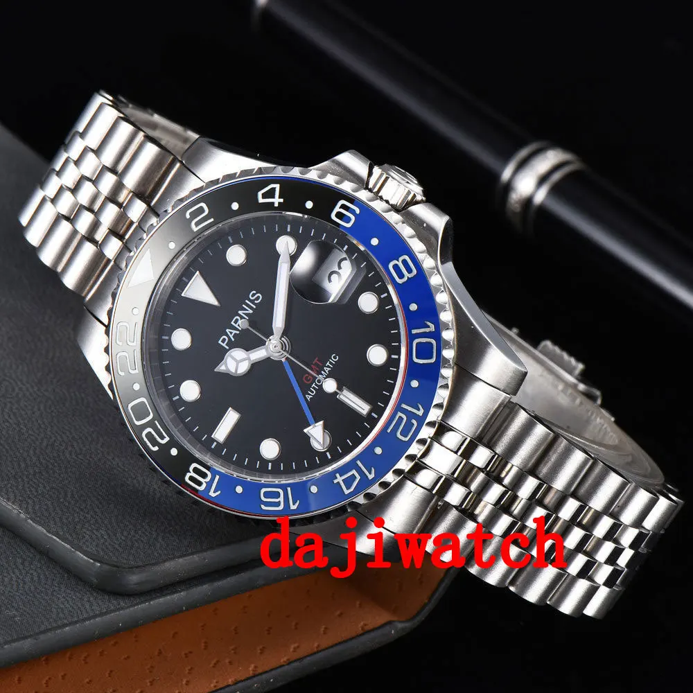 40mm PARNIS Sapphire Crystal GMT Automatic machinery movement luminous men's watches Blue & black ceramic bezel Mechanical watch