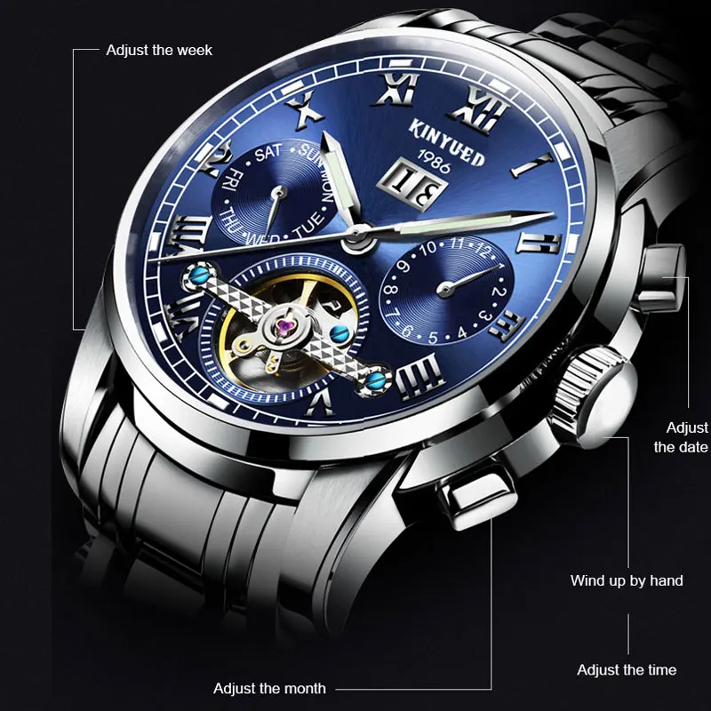 | KINYUED Blue tourbillon steel watch male automatic mechanical watch multi-function calendar watches men waterproof clock Hollow |