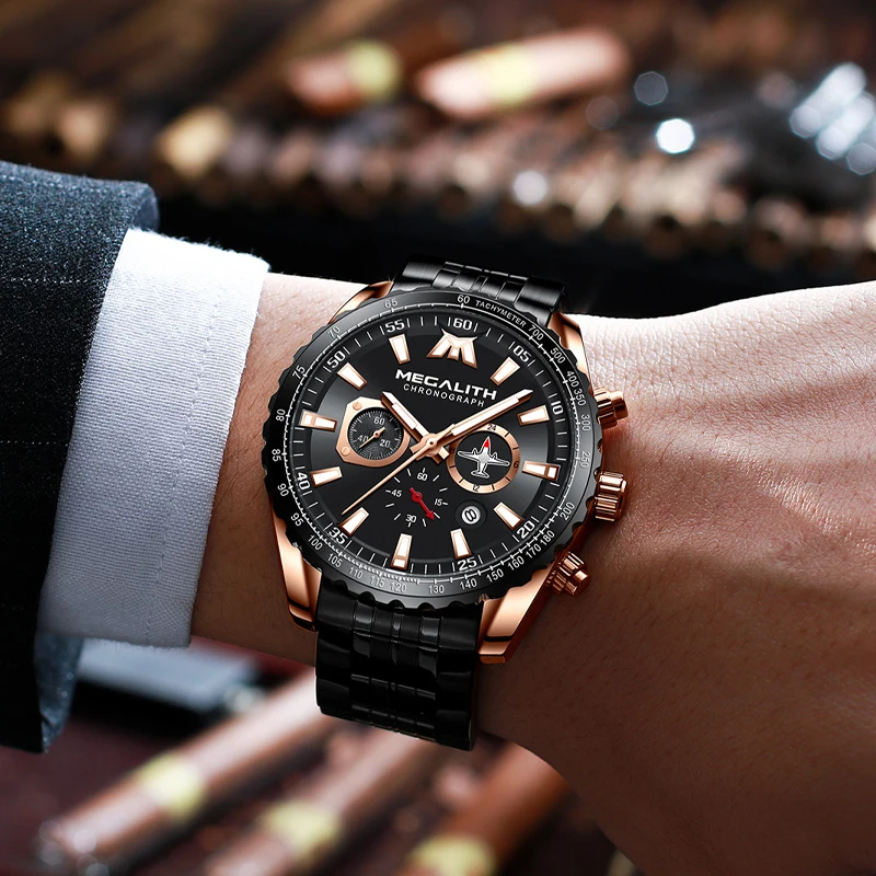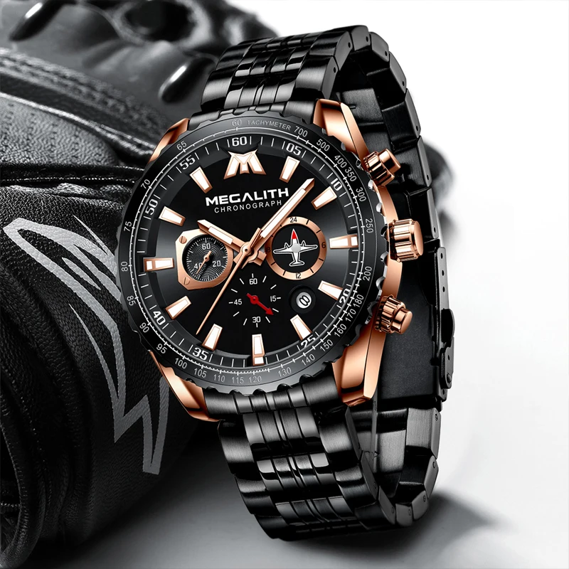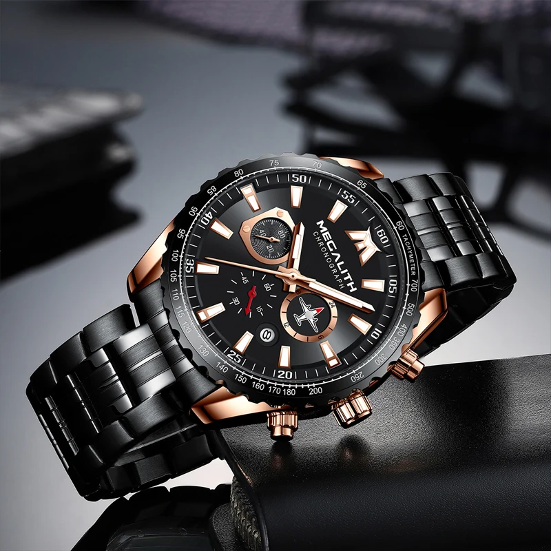 MEGALITH Luxury Mens Watches Sports Chronograph Waterproof Analog 24 Hour Date Quartz Watch Men Full Steel Wrist Watches Clock