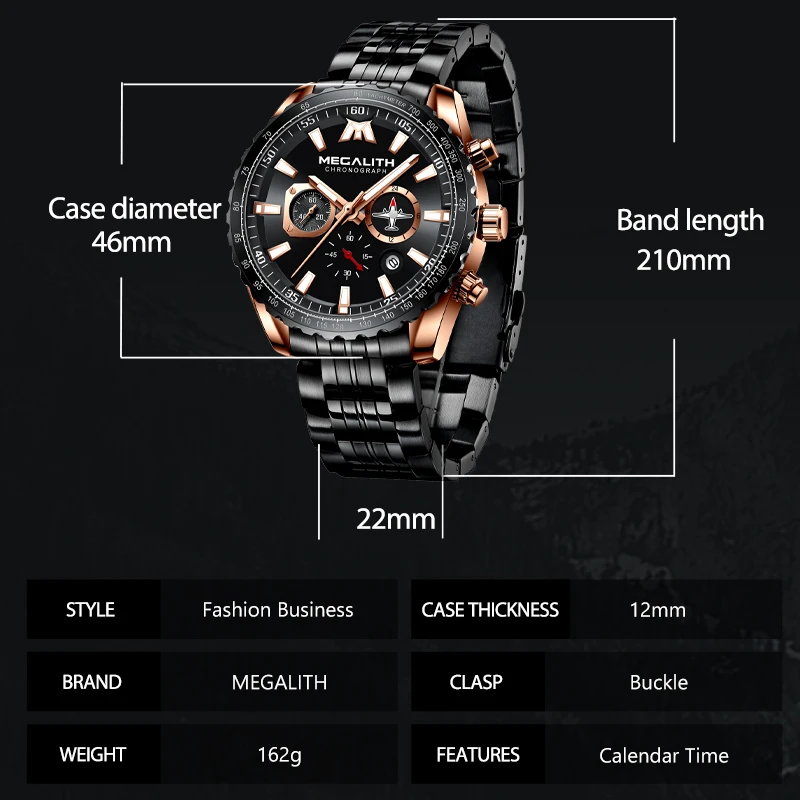 Features:MEGALITH Original Watches100% new with tag and quality quarantee;3ATM Water Resistant (You can use it when raining and washing hands, DON'T support hot water and swimming);With Chronograph (Stopwatch) and Luminous Function, with Date display; Perfect for all kind of business, casual,Sports, indoor activities or daily use.Specifications:Item: Men WatchWatch Type: Quartz Watch / Fashion Watch / Men WatchFunction: Chronogarph, Stopwatch, Luminous, Calendar (Date), WaterproofCase Material: AlloyBand Material: stainless steelMovement: quartz watch Parameters:Dial Diameter: 46mmCase Thickness:11mm Watch Length:21cm Band Width: 22mm Water Resistance:3BarPackage Included:1 x Megalith Watch1 x Megalith original watch velvet bag1 x Megalith watch manual
