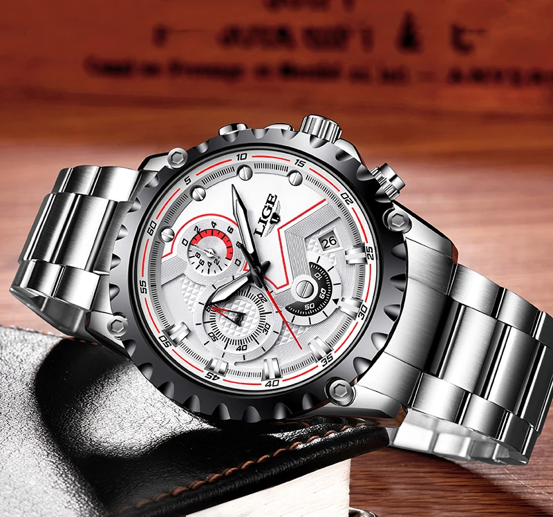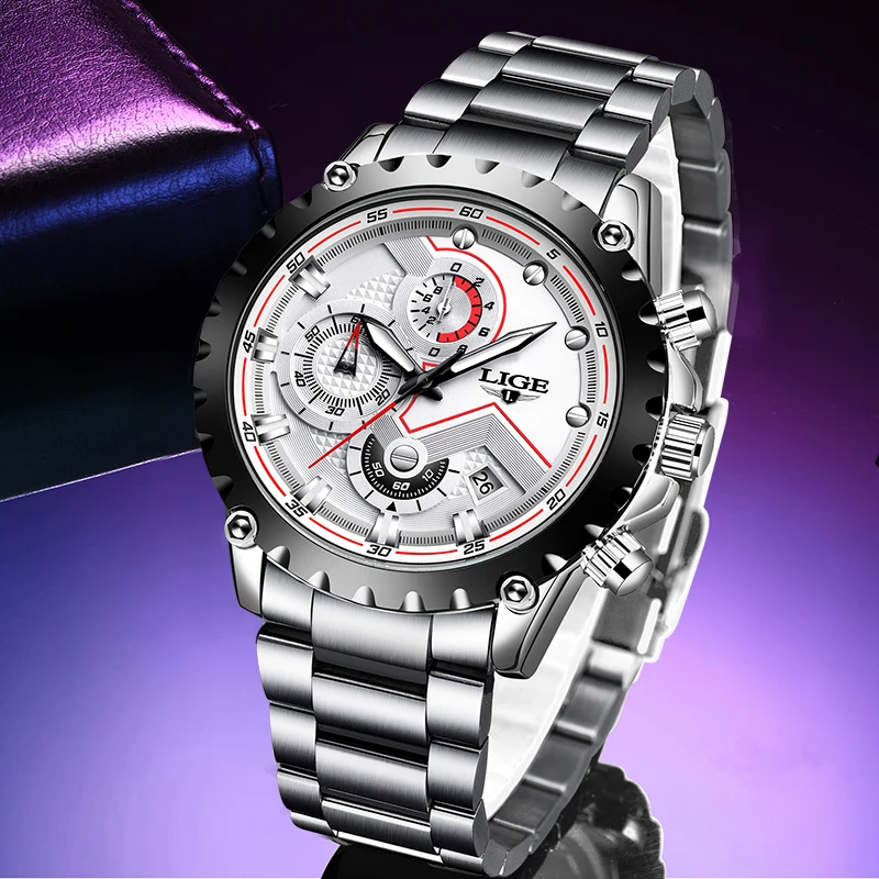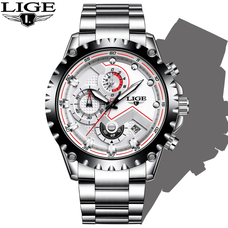 | 2020 LIGE Fashion Silver Mens Watches Top Luxury Brand Stainless Steel 30m Waterproof Quartz Watch Men Army Military Chronograph |