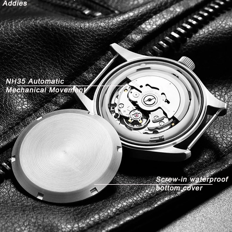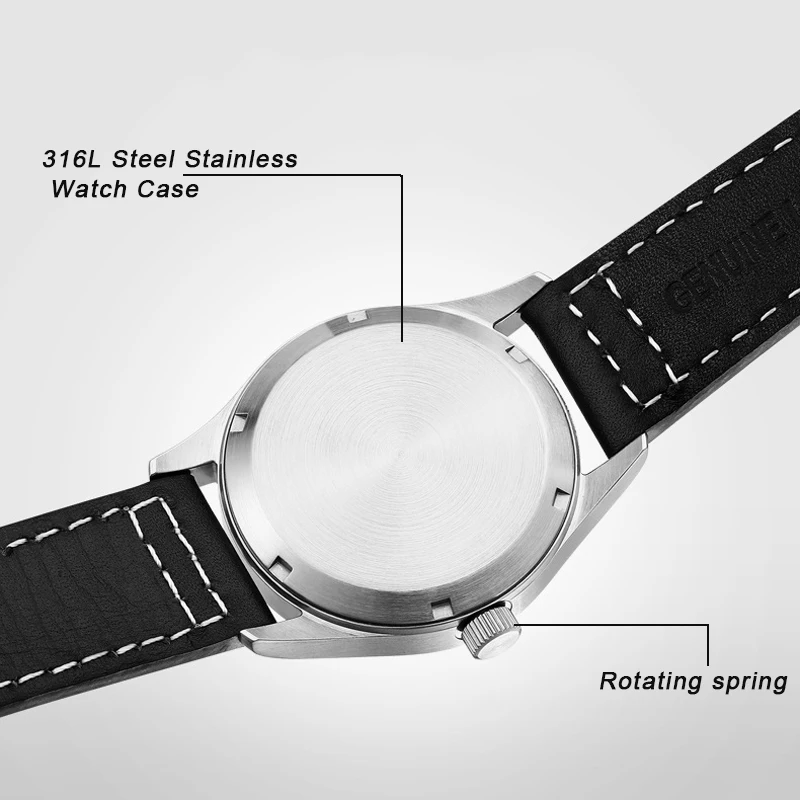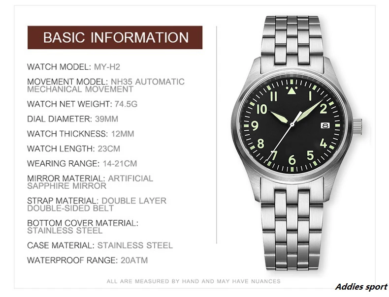 Model:MY-H2Movement:Japan NH35 Automatic Mechanical MovementCase Material:316L stainless steelCase diameter:39mm (excluding crown)Case length: Length 49mm (including lugs)Case thickness: Thickness 12mm (including mirror)Case ear position: Ear width 20mm (with the inside of the strap)Watch net weight:74.5gClasp:BuckleMirror:sapphire crystal glass, inner shadowless anti-reflective filmPanel: BlackPointer: luminous pointerLuminous: C3 super luminous (light color: green)Crown: Screw-in, size 6mmBottom cover: screw-in bottom coverStrap:316L Sstainless steel strap/ leather strapWaterproof: 200 meters waterproof