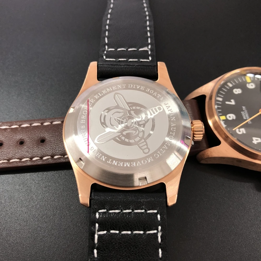 Movement type: automatic mechanical movementMovement model: Japan NH35Movement characteristics: 3-pin / calendar, frequency 21,600 times per hour(3Hz), stop-second device, two-way automatic winding, 24 stones, 41 hours energy storageCase material: CUSN8 bronze imported from GermanyCase Craft: BrushedBottom cover material: 316L stainless steelBottom cover type: Screw-in bottom coverCase diameter: 39mm (excluding bar)Case length: 49mm (total length above and below)Case thickness: 12.8mm (including mirror and bottom cover) Case ear position: 20mm (where the case and strap are linked)Head weight: 61g (without strap)Whole table weight: 74.0g (including leather strap)Watch length: 250mm (total watch length / perimeter)Strap material: leatherTable material: synthetic sapphireMirror Type: Double SapphireMirror coating: anti-glare blue coatingMirror size: 34.0 * 2.9mm (diameter * thickness)Head type: screw-in lockHead size: 7mm (diameter) Bezel Material: NoneBezel Features: NoneBezel Luminous: NoneBezel size: NoneSurface color: Matt black print C3 + BGW9 two-color super luminousSurface luminous: 240,000 / KG Swiss C3 super luminous powder, green light surface size: 34.0 * 33.6 * 33.0 * 0.4mm (silk hole * face diameter * open face * thickness)Pointer technology: copper-colored hour, minute and second handsLuminous hands: 240,000 / KG Swiss C3 super luminous powder, green light Pointer: 9.5 * 14.5 * 14.5mmWaterproof level: 200 meters waterproof / diving [can wash hands, swim, dive, meet all daily waterproof use]Exhaust valve: NoneWarranty period: three years free warrantyPackaging standard: professional waterproof plastic box packaging