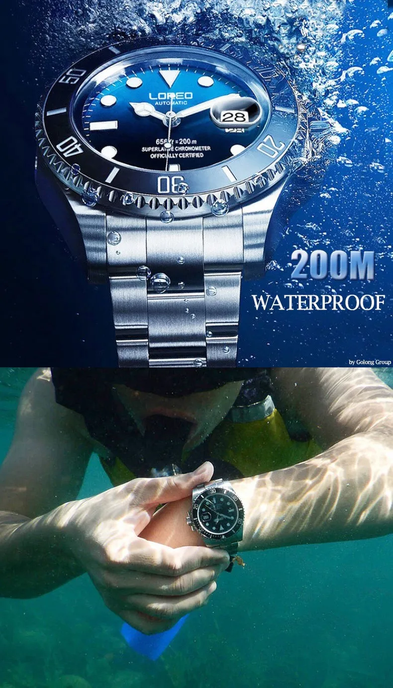 LOREO Men Watches Auto Date Sapphire Watch Sports Stainless Steel Strongest Luminous Waterproof 200m Diver Mechanical Wristwatch