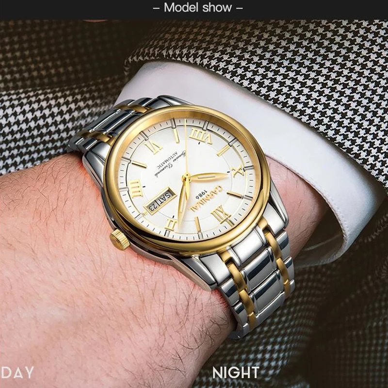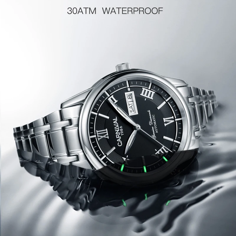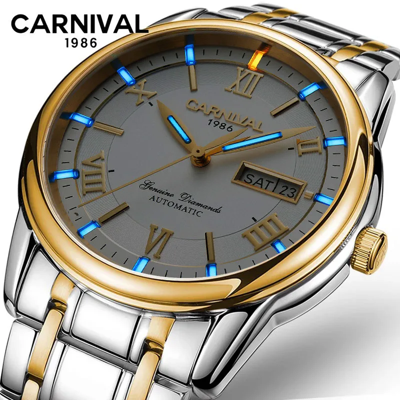| CARNIVAL Tritium Luminous Mechanical Watch Men Wrist Automatic Watches Men Waterproof Calendar Full Steel Watch Montre Homme |