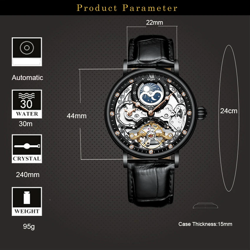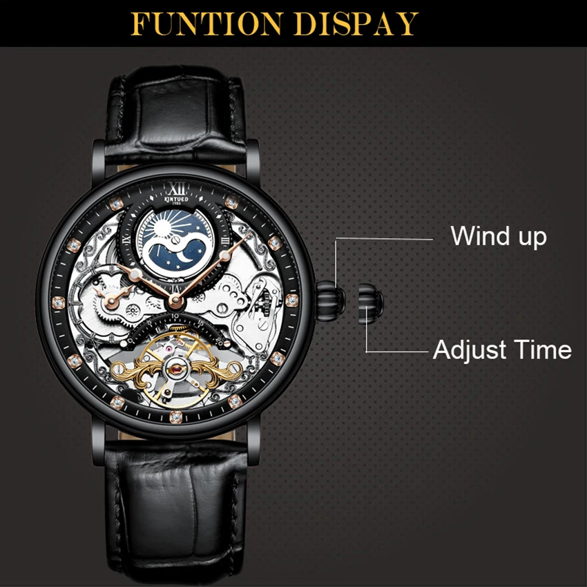 KINYUED Skeleton Automatic Watch Men Sun Moon Phase Waterproof Mens Tourbillon Mechanical Watches Top Brand Luxury Wristwatches