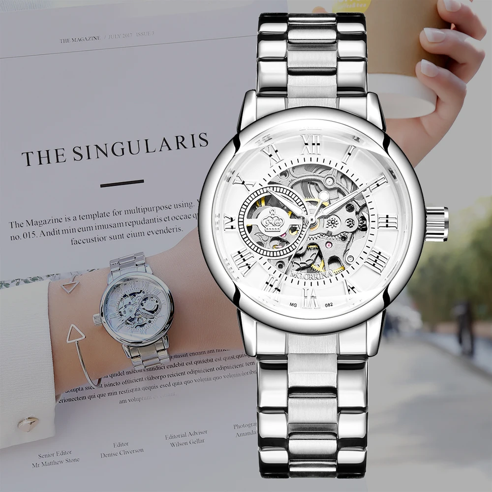 OUYAWEI Women's Watch Automatic Mechanical Lady Wristwatch Skeleton Crystal Dial Female Clock Stainless Steel Band Reloj Mujer