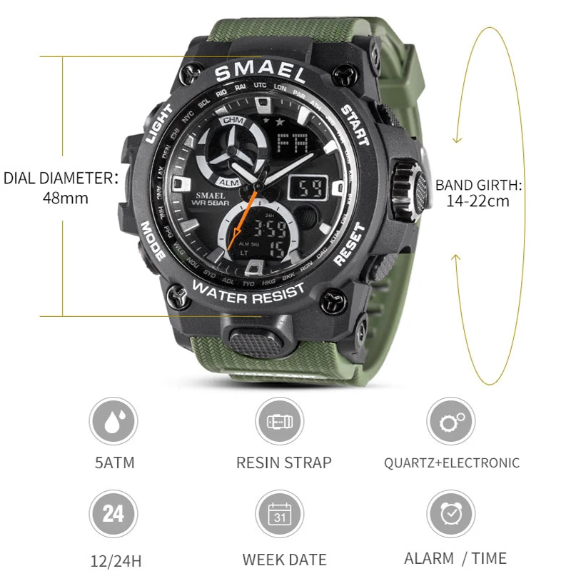 SMAEL Sport Watch Men Watches Waterproof 50M Wristwatch Relogio Masculino Big Dial Quartz Digital Military Army Clock 1805