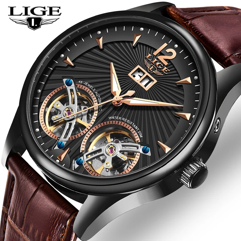 | 2020 Fashion LIGE Mens Watches Top Brand Luxury Waterproof Sport Watch Men Leather Tourbillon Automatic Mechanical Wristwatch |