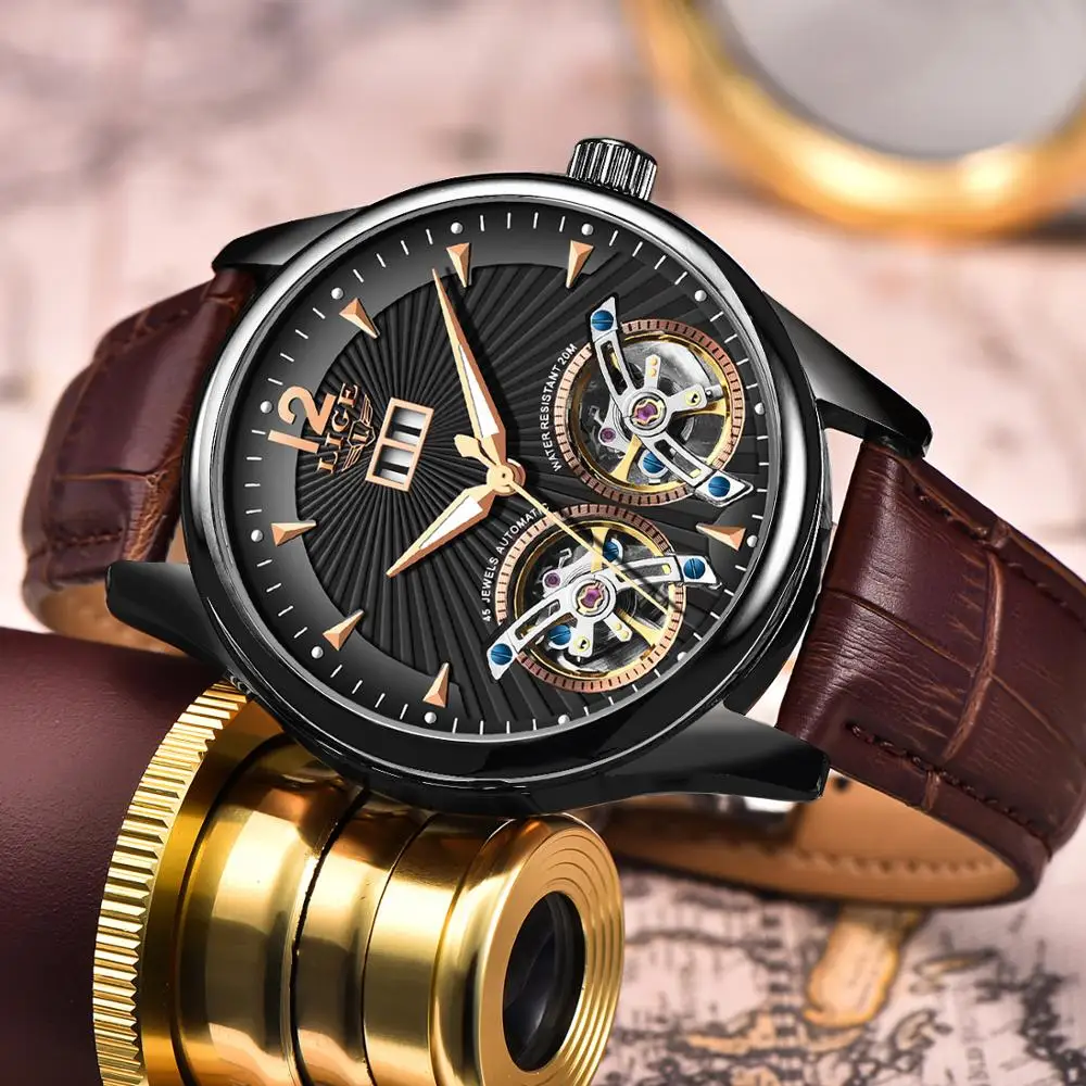 LIGE Brand Men Watches Automatic Mechanical Watch Tourbillon Sport Clock Casual Leather Business Wrist Watch Gold Relojes Hombre