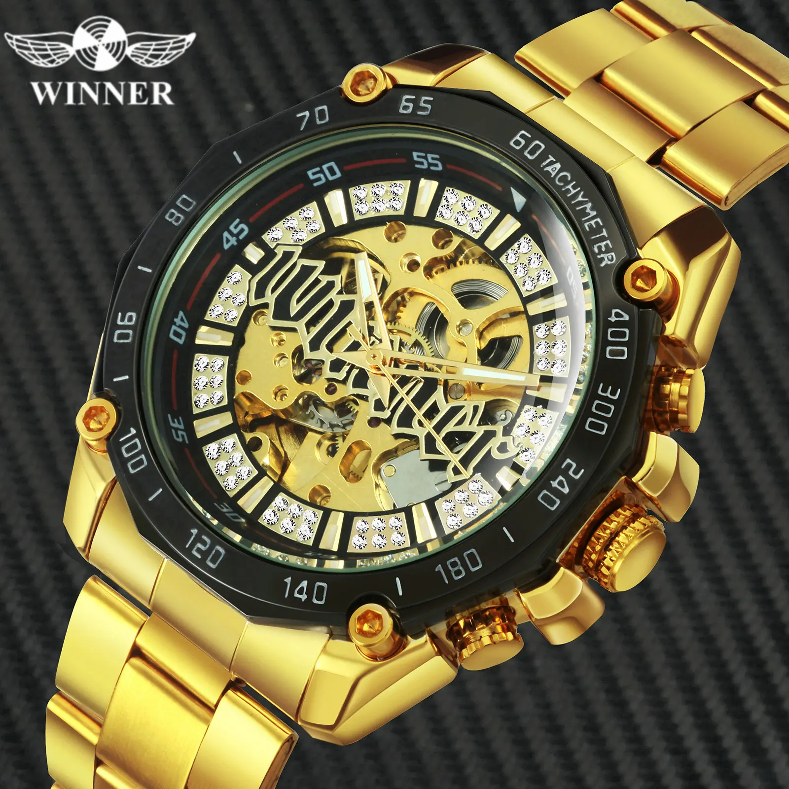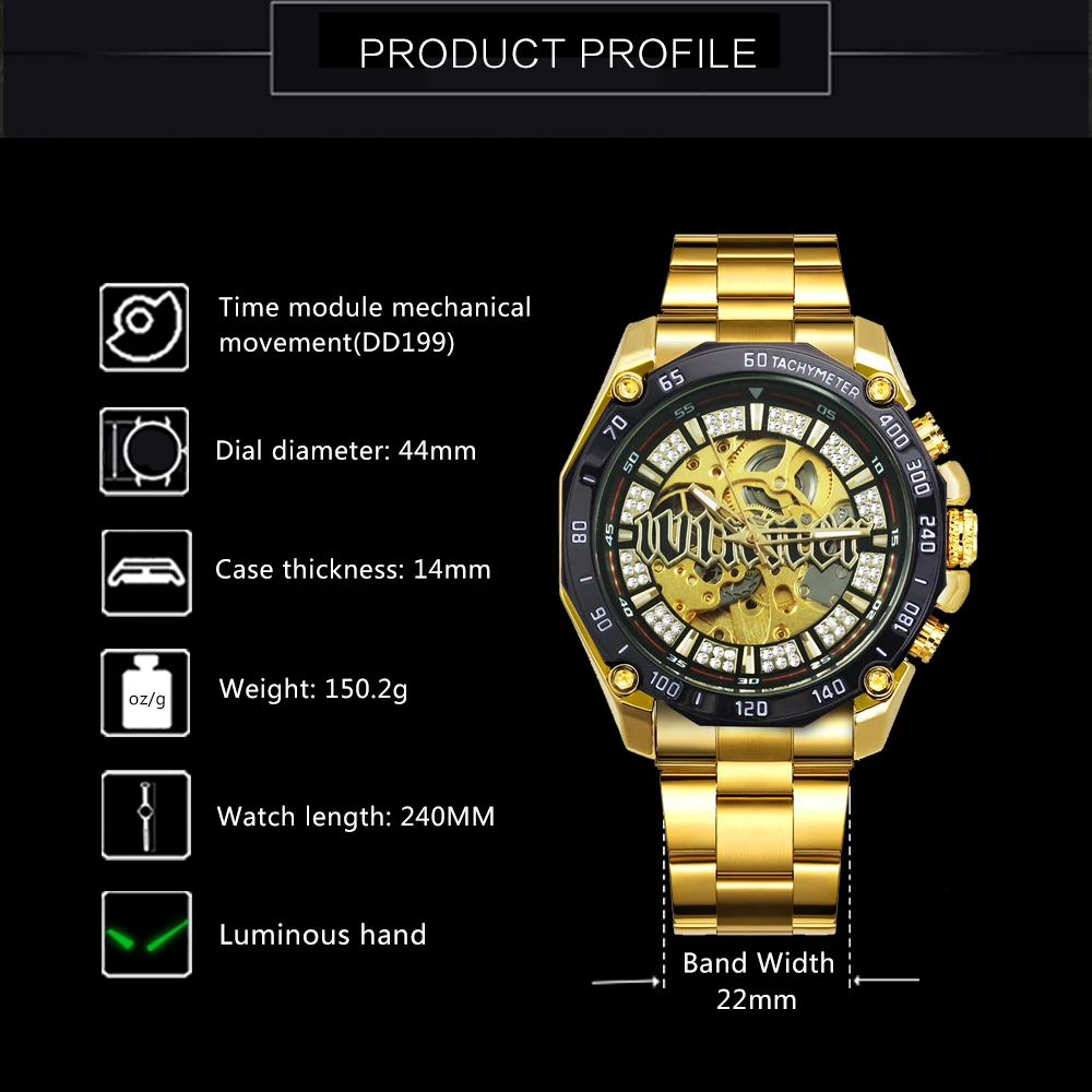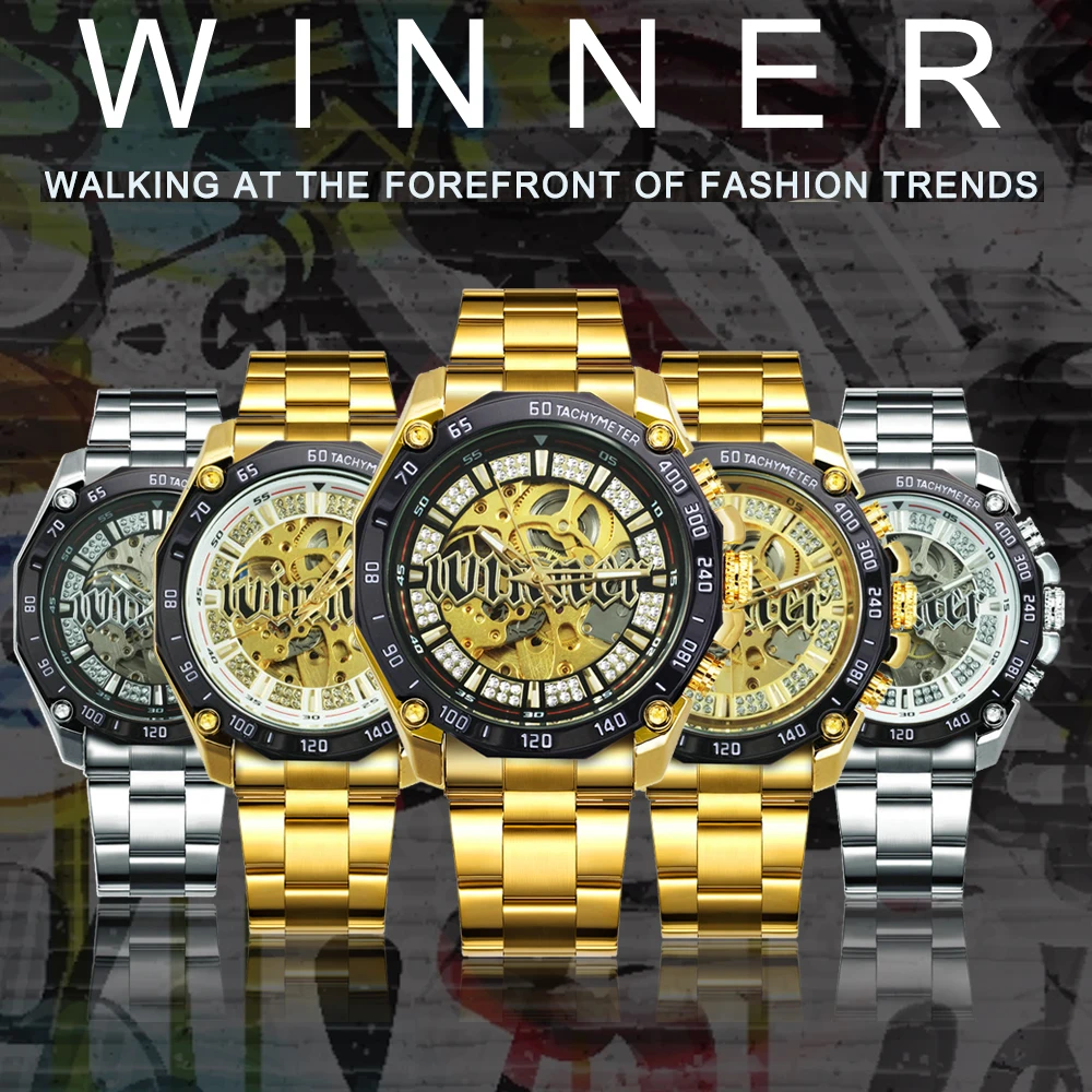 | WINNER Official HIP HOP Golden Automatic Watch Men Diamond Iced Out Skeleton Mechanical Watches Brand Luxury Punk Wristwatches |