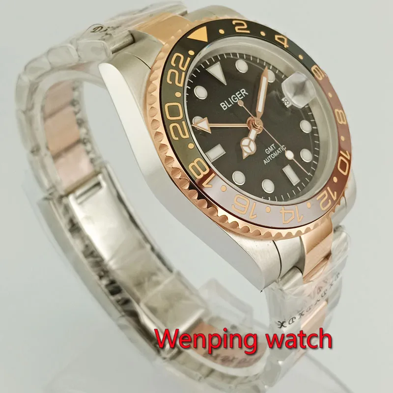 Best Price Comparison With Bliger 40mm black dial Sapphire glass Ceramic Bezel GMT hand Automatic watch Golden middle steel belt W2625