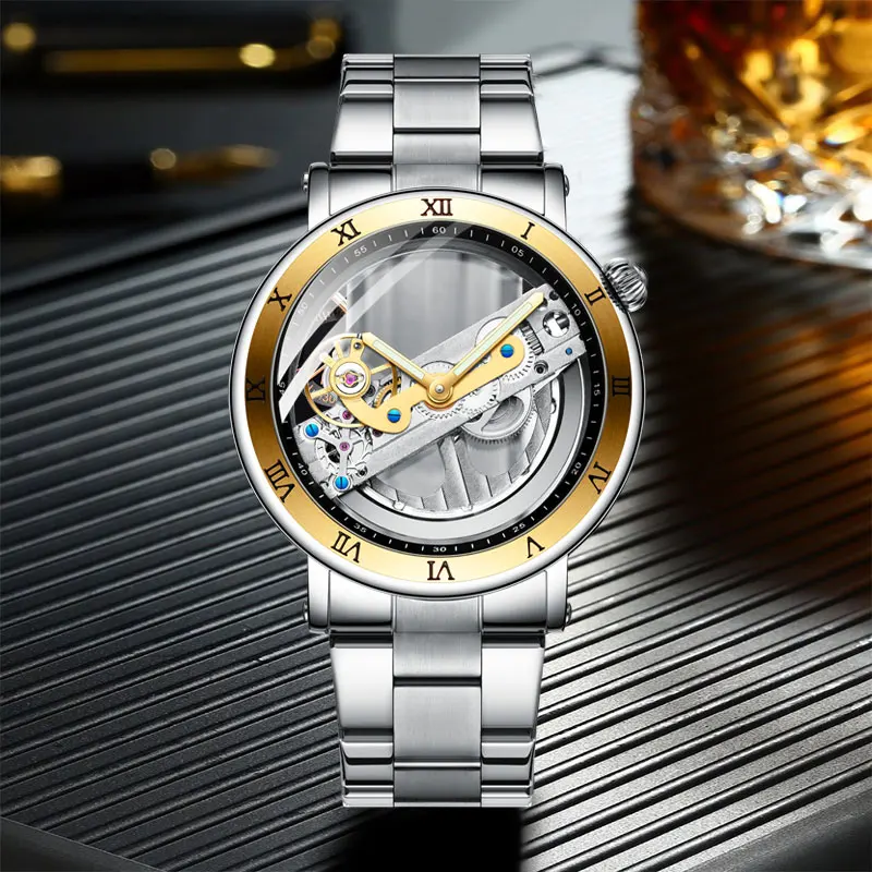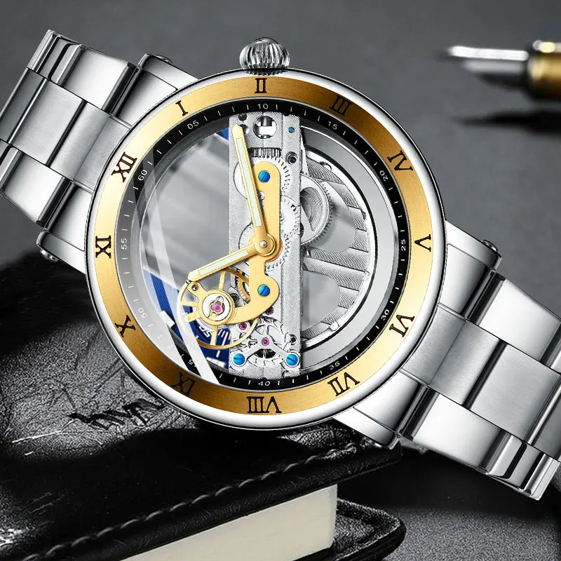 2019 FORSINING New Fashion Luxury Top Brand Golden Bridge Skeleton Automatic Mechanical Stainless Steel Strap Men Wrist Watch