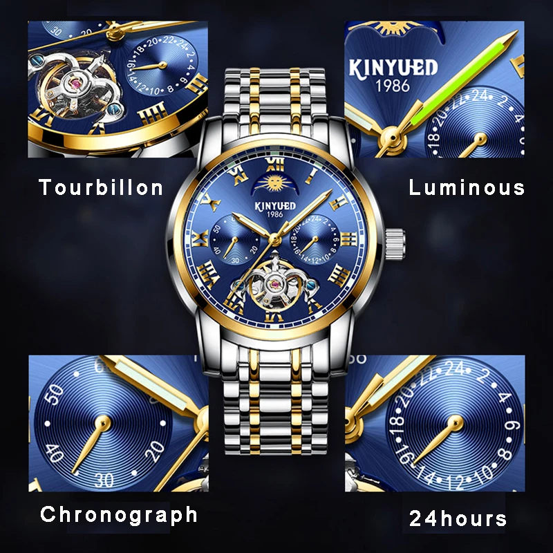 | KINYUED Luxury Automatic Watch Men Moon Phase Tourbillon Mechanical Watches Chronograph Stainless Steel Clock Relógio homens |