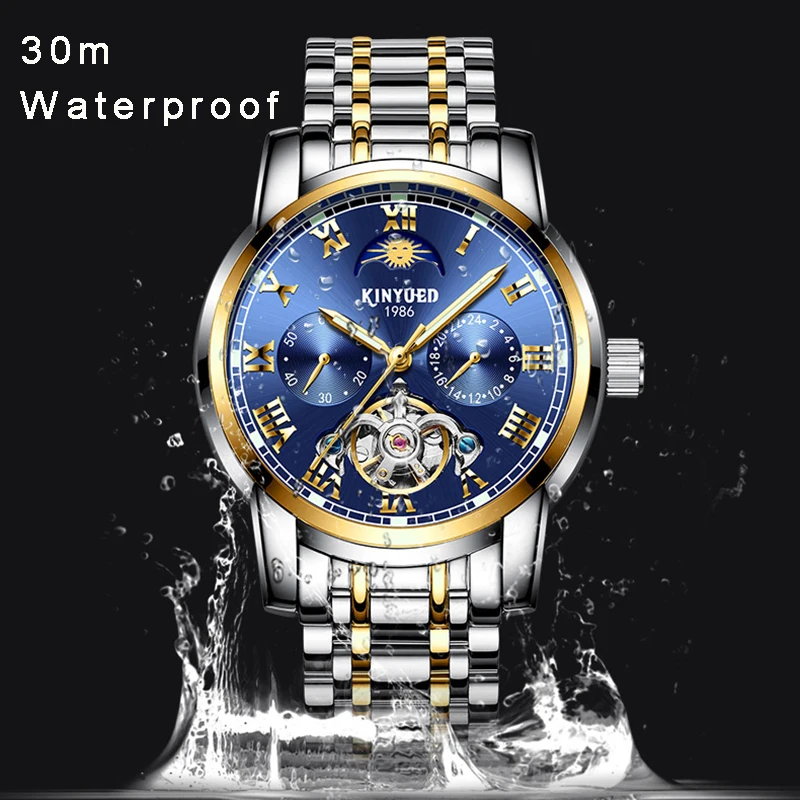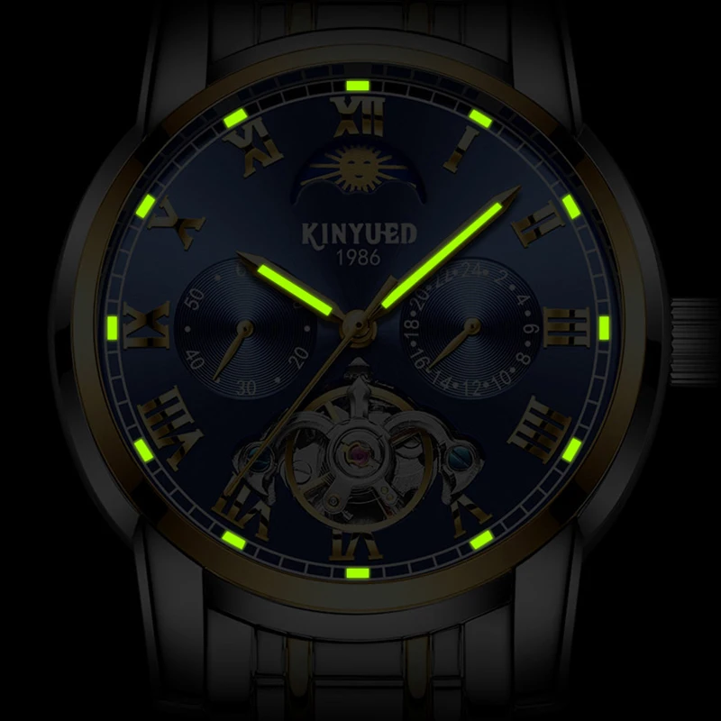 KINYUED Blue tourbillon steel watch male automatic mechanical watch multi-function calendar watches men waterproof clock HollowBuy Now On Aliexpress