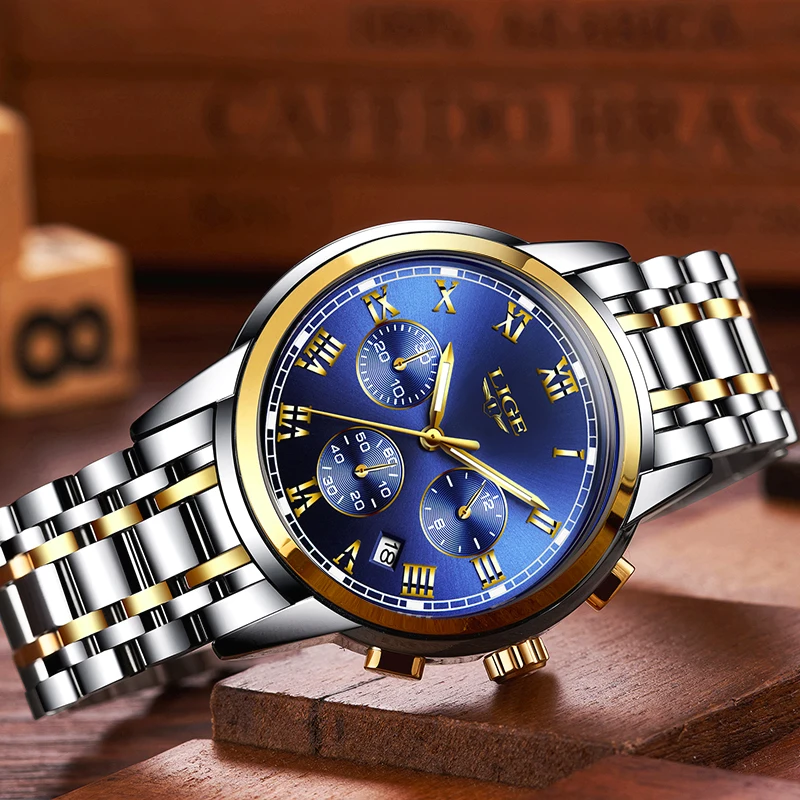 LIGE Mens Watches Top Brand Luxury Chronograph Fashion Watch Men Business Waterproof Gold Steel Quartz Watch Relogio Masculino