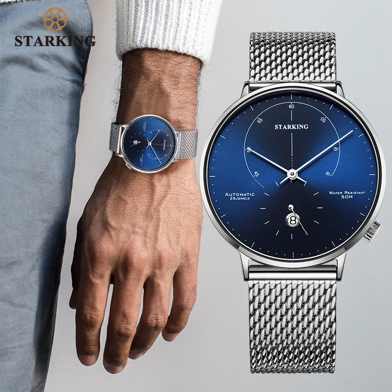 STARKING New Arrival Automatic Watch Stainless Steel Men Luxury Brand 50m Waterproof Mechanical Wristwatch Moon Phase Clock Men