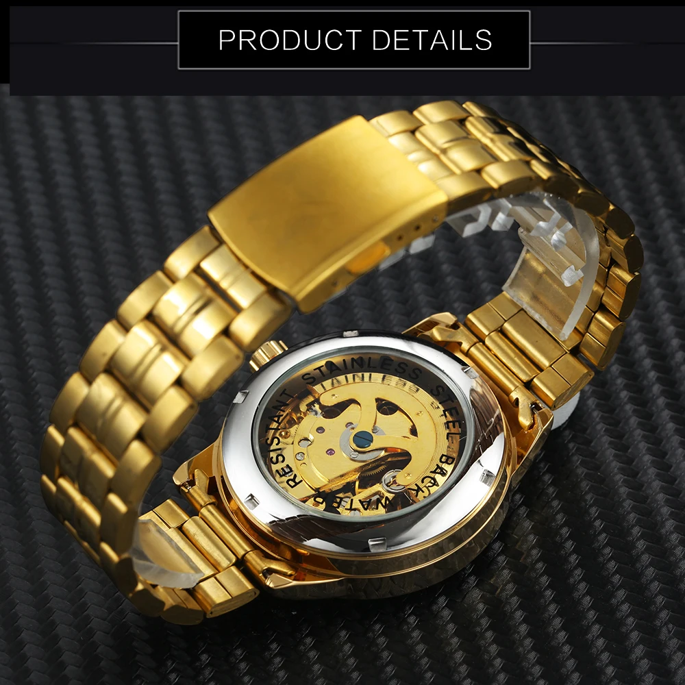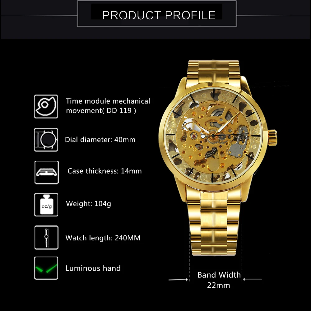 | WINNER Official Brand Luxury Golden Automatic Watch Men Simple Skeleton Dial Stainless Steel Strap Fashion Business Wristwatches |